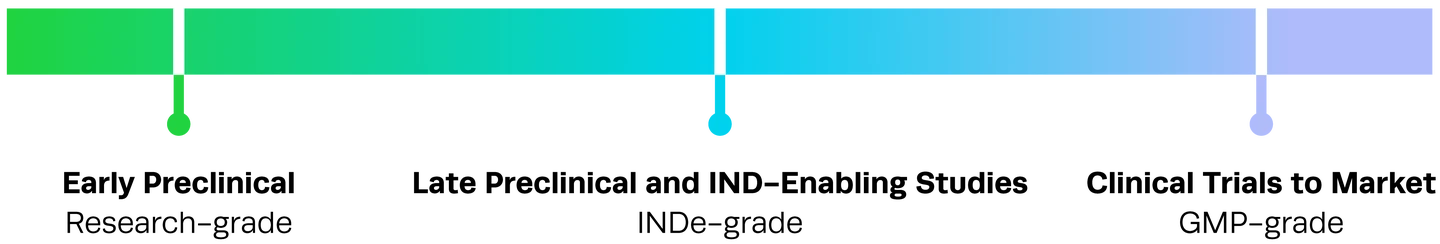 Initiate GMP-grade production as soon as your program transitions to clinical success. From early-phase trials to large-scale manufacturing, this ensures regulatory approval and patient safety.